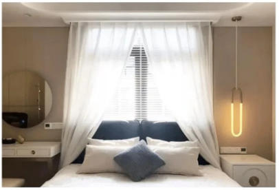 床頭后背是窗戶,晚上睡覺容易濕氣吹頭、容易感冒頭疼。早上起床的光線透過窗簾縫隙容易照射眼睛。