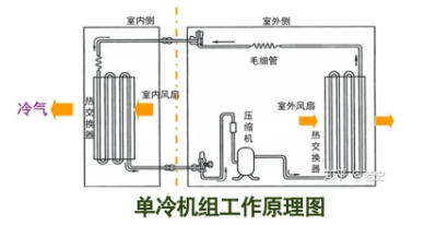 制冷循環(huán):壓縮機將蒸發(fā)器內(nèi)的低溫低壓的制冷劑蒸氣吸入壓縮機內(nèi),經(jīng)壓縮后成為高溫高壓的氣體排入冷凝器;在冷凝器內(nèi),高溫高壓的制冷劑氣體與空氣進行熱交換,把熱量傳給空氣后冷凝成為高溫高壓的制冷劑液體,再經(jīng)過毛細(xì)管節(jié)流降溫降壓后進入蒸發(fā)器,進入蒸發(fā)器的氣液兩相制冷劑在蒸發(fā)器中完全蒸發(fā),從而冷卻室內(nèi)空氣;從蒸發(fā)器中出來的蒸氣再次被壓縮機吸入壓縮,這樣周而復(fù)始地連續(xù)循環(huán),被冷卻的空氣連續(xù)從風(fēng)管中送出。