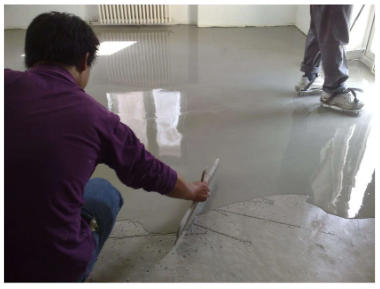 調(diào)配好的呈流體狀,具備良好的流動性,不需要像水泥砂漿找平多重振搗抹壓,倒在需要找平的地面上通過自流平耙子輔助加快材料自然流平。